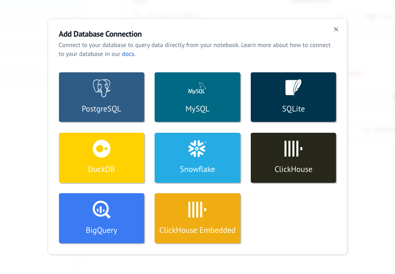 Click the "Add Database Connection" button in your notebook to connect to PostgreSQL, MySQL, SQLite, DuckDB, Snowflake, or BigQuery databases. The UI will guide you through entering your connection details securely. Environment variables picked up from your dotenv can be used to fill out the database configuration fields.
