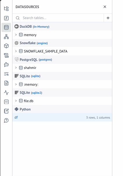 marimo will automatically discover the database connection and display the database, schemas, tables, and columns in the Data Sources panel. This panels lets you quickly navigate your database schema and reference tables and columns to pull in your SQL queries.