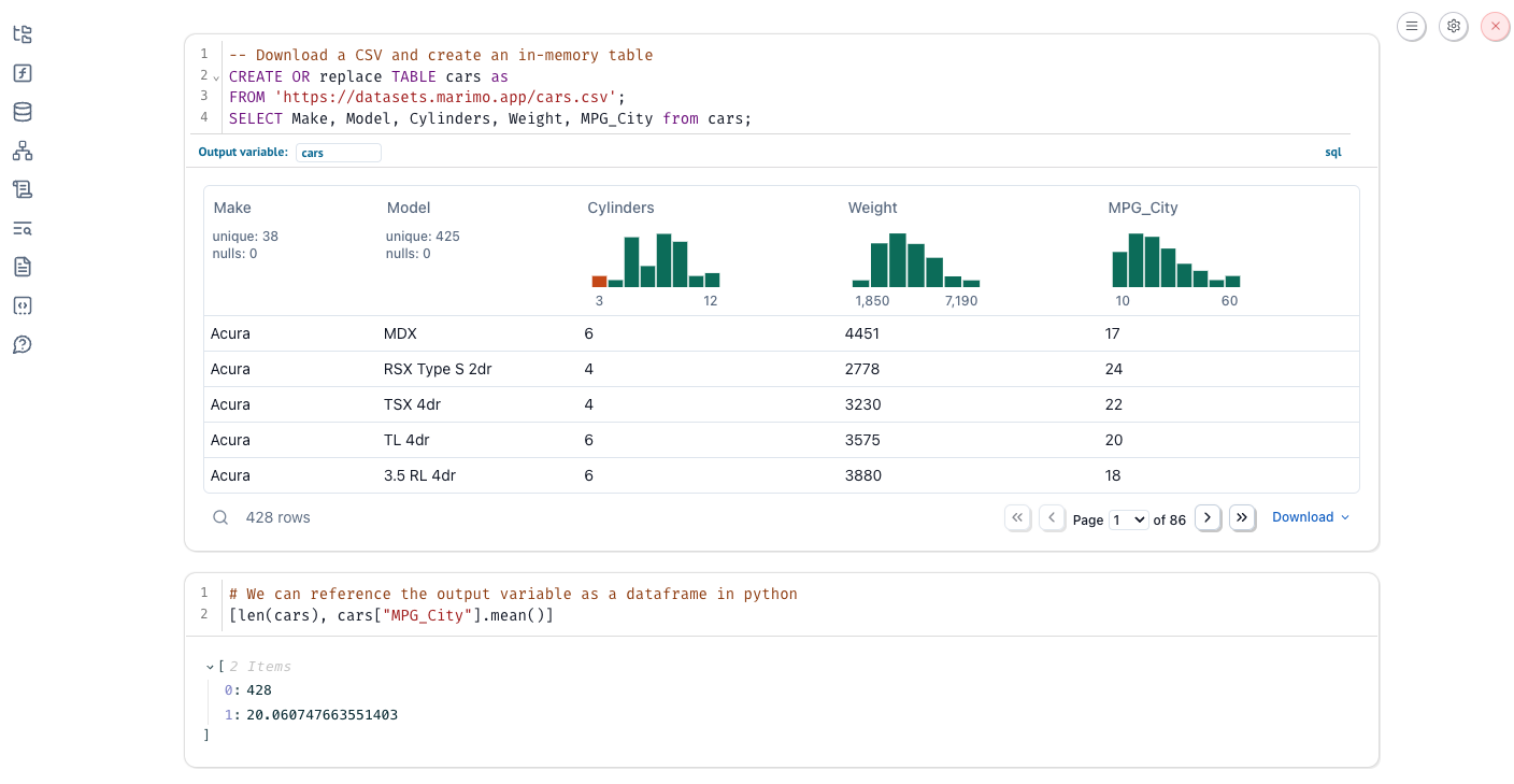 marimo lets you mix and match Python and SQL: Use SQL to query Python dataframes (or databases like SQLite and Postgres), and get the query result back as a Python dataframe.